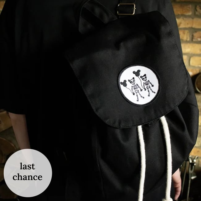 A cute & spooky backpack featuring two spooky skeletons on an embroidered patch.